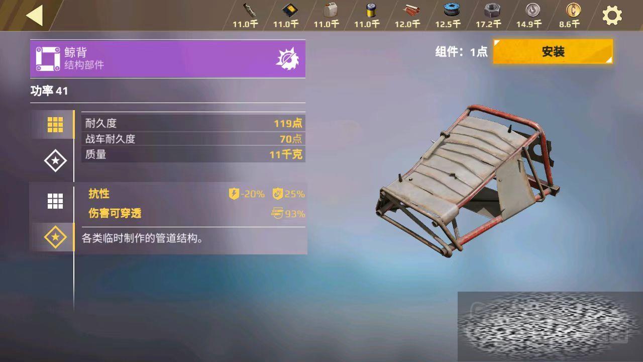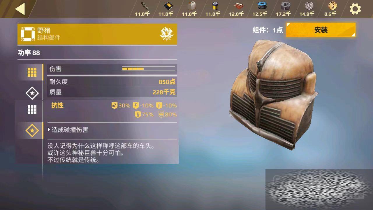 第2项撞击板,在抗性界面中具有造成碰撞伤害的部件,这种部件并没有战车耐久度的属性,因此无法提升载具的耐久度,但是在一般情况下,这些部件自身的耐久度和伤害抗性都非常优秀,还能在撞击时候提供一定的伤害加成。例如小编下图所提供的野猪,就是很出色的撞击板,它是载具的车头,撞击的时候能够造成更多伤害,自身也非常耐撞。