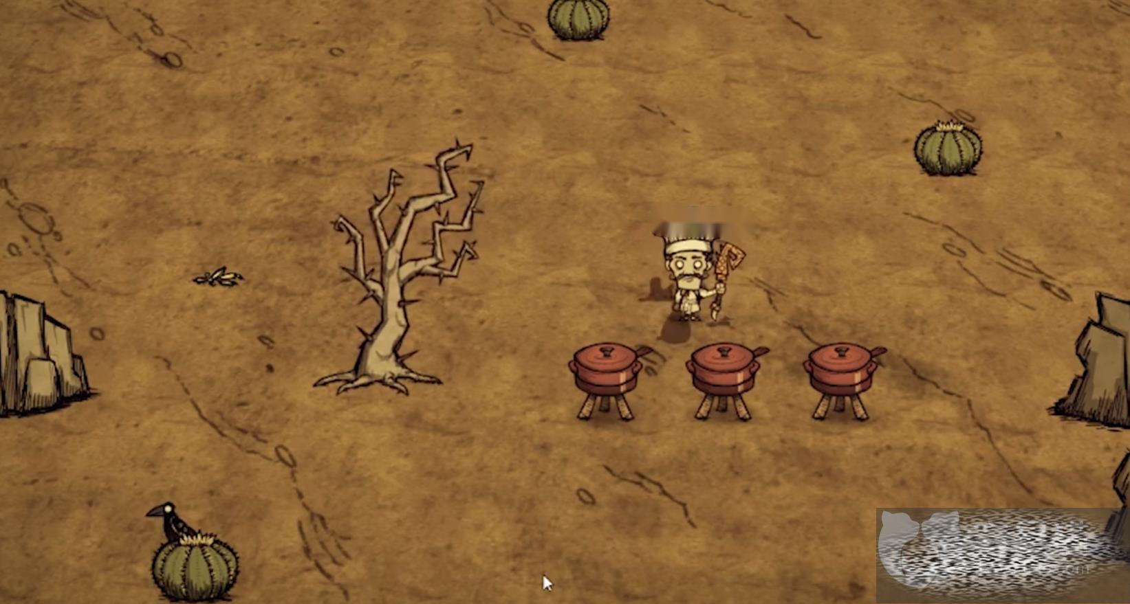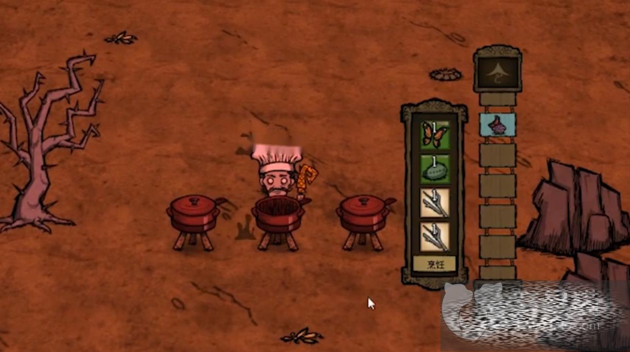 大家准备好自己的锅子,在锅子里面放入仙人掌,之后按照图中所示放入树枝和蝴蝶等等素材,然后等待一段时间之后就能获取烤仙人掌了,这个食谱的作用就是用来回复脑残值,在游戏的前期是非常重要的食物。