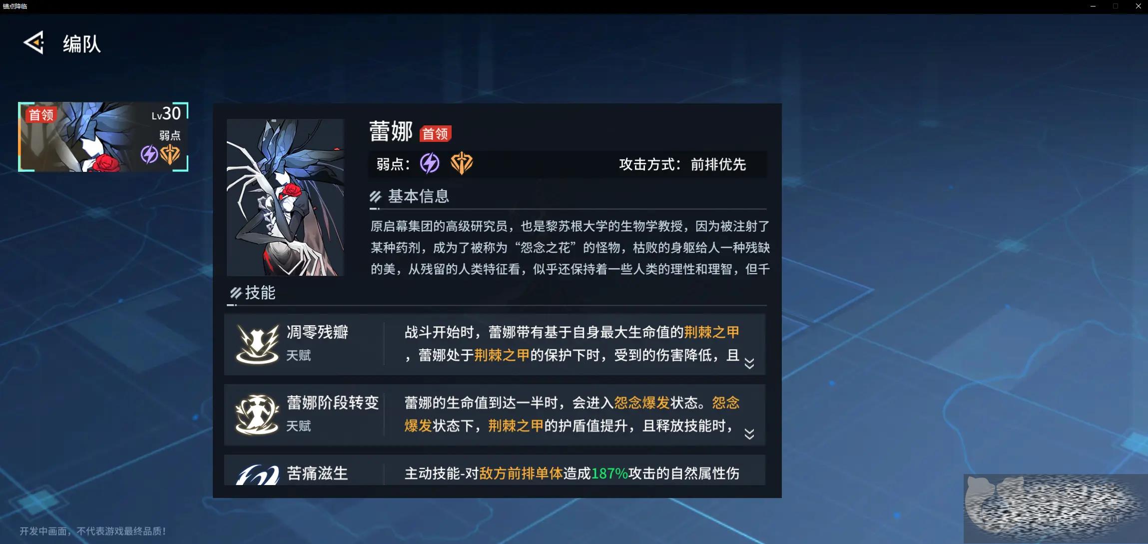 第二个角色【霓】在伤害上来看,可能不太出色,但是可以提供给轰炎队增伤以及对敌方的debuff效果,双天赋不光可以给队友提供稳定增伤,还对十二格范围的三技能具有降低回复效果,在配合轰炎抗性降低的效果十分好用,进行到中期想放大配队伤害那属于是练了不亏。