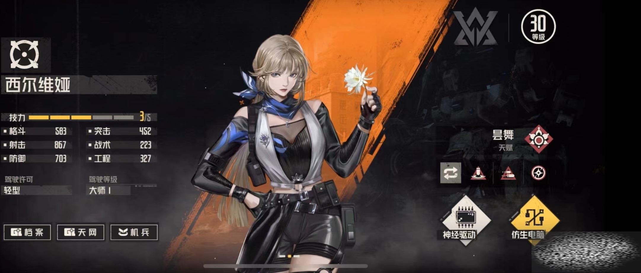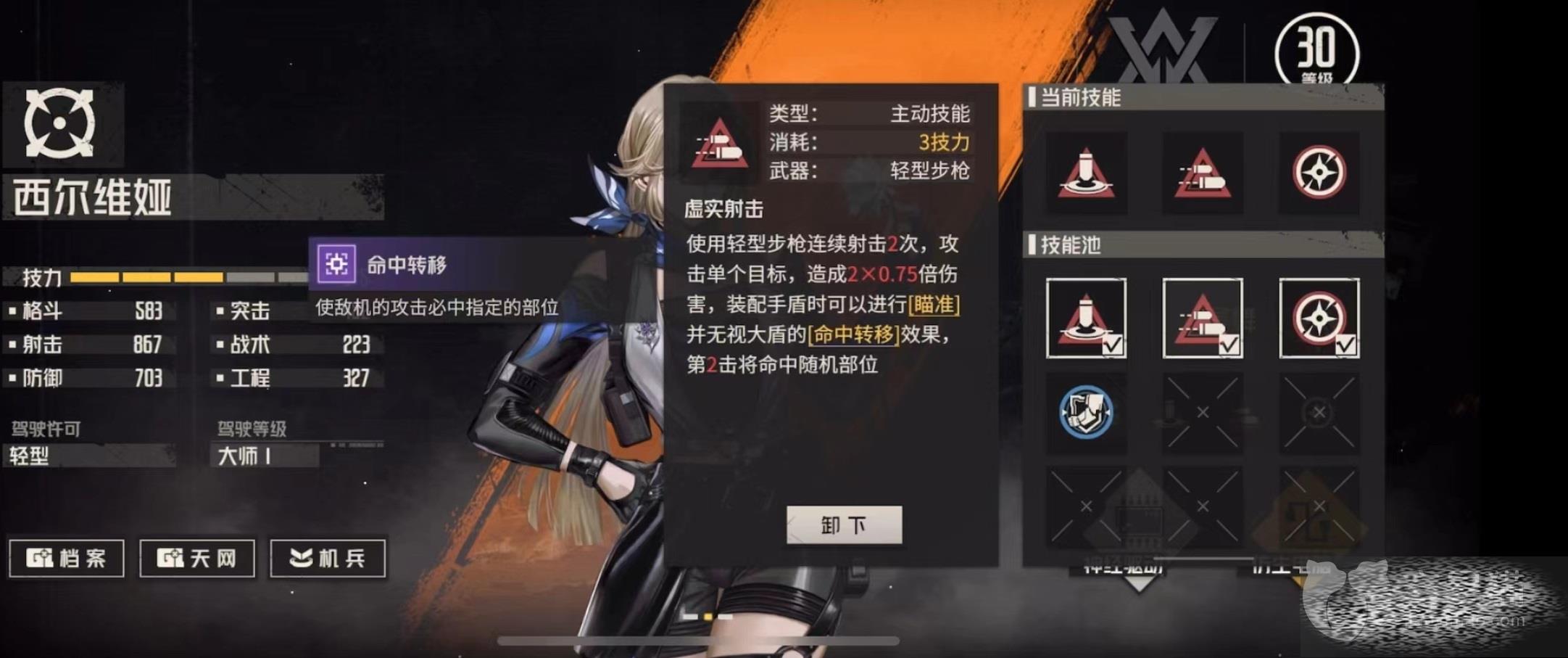 被动昙舞,使装配手盾时轻型步枪主动攻击时能够进行瞄准,战后可以将剩余移动力利用起来,继续移动。肃清,在攻击耐久时低于50%部位时伤害提升。残魂,使得该角色手臂被击破时提高回避率,影形,是在腿部被击破时移动力不会下降,这两个被动在实战中还是很有效果的,可以不用惧怕腿部被打掉以后无法行动。最后猎袭是在发动攻击时距离目标越远,伤害提升越高,最多能提升到20%。