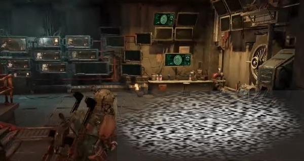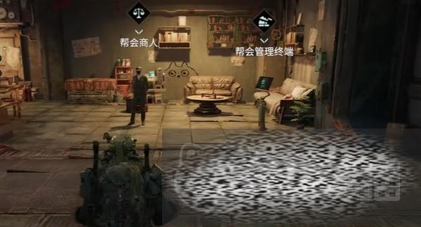 系统提示说是宝箱在墙上,其实就是有很多屏幕的墙上,如图所示靠近后按F键互动,帮助你的帮会成员完成一些特殊的任务,就会有一个礼物的选项,点击就可以领取帮会成长礼包。