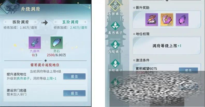对洞府进行升级,能加快修炼的速度。洞府等级提高后,能让自动吐纳灵气速度加快。九曲木则是提升必备资源,可通过加入宗门的方式获取,使用宗门贡献可兑换该道具,自身道院的地位提升也很重要,可进一步提高它的上限,而提升地位则要对威望积累,威望值则能去做道院悬赏、试炼来暂时的获取。