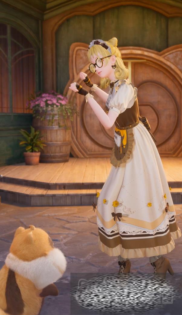 第三套“甜润蜜糖”,这个装扮整体都非常可爱,可爱的发型,可爱的围裙,整个呈现一种“咖啡女仆”的感觉,是咖色和黄色为主,眼镜设计的也非常有特点,呆萌呆萌的。