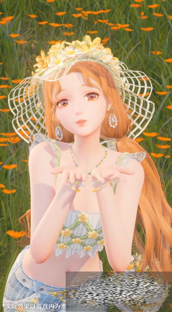 第四套“晴日悠行”,非常亮眼清新的一套搭配,下半身牛仔裤,上半身小吊带,戴着一个太阳帽,整体清新又不失性感,还搭了一个花球链条包,晴日里的小太阳装扮。