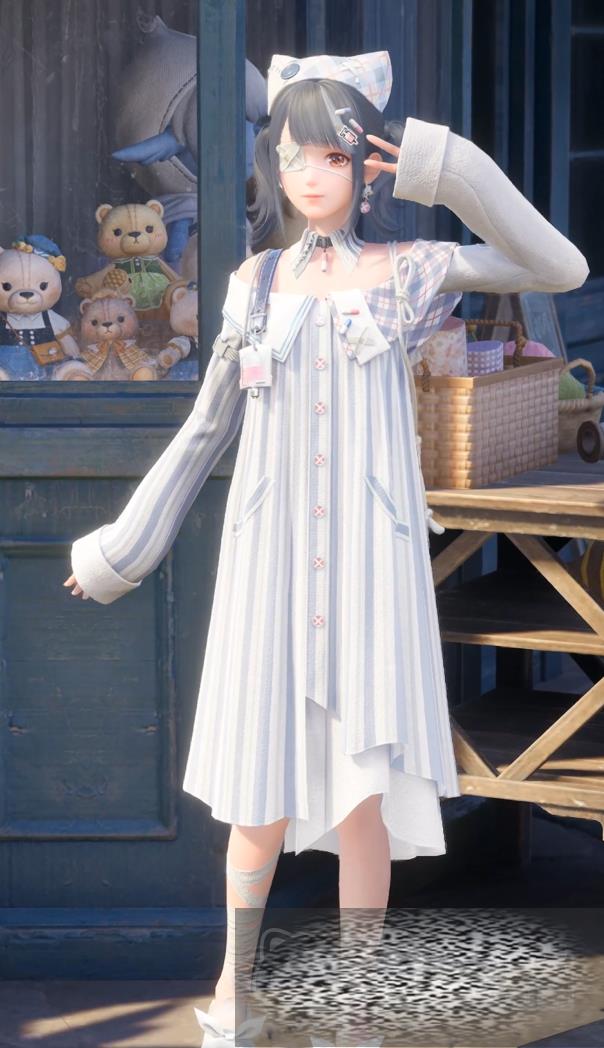 最后一套“实验奇想”,该服装很有实验感,有点类似“病号服”的裙子,以及护士帽的造型,外加一个具有特点的眼罩,搭配小输液包和药丸,非常的可爱。