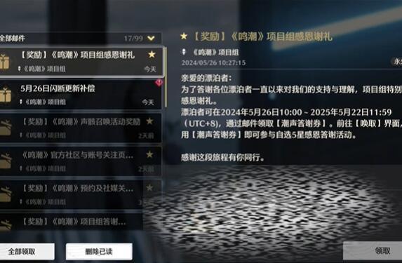 点击该图标进入终端界面,该界面往最下面看,可以看到“邮箱”,点击进入邮箱,就可以看到官方的一个感谢礼,点击之后就能够领取到”潮声答谢券”,这个答谢券就是可以让小伙伴们免费去选择一个定向的五星角色的。