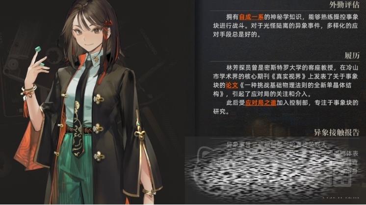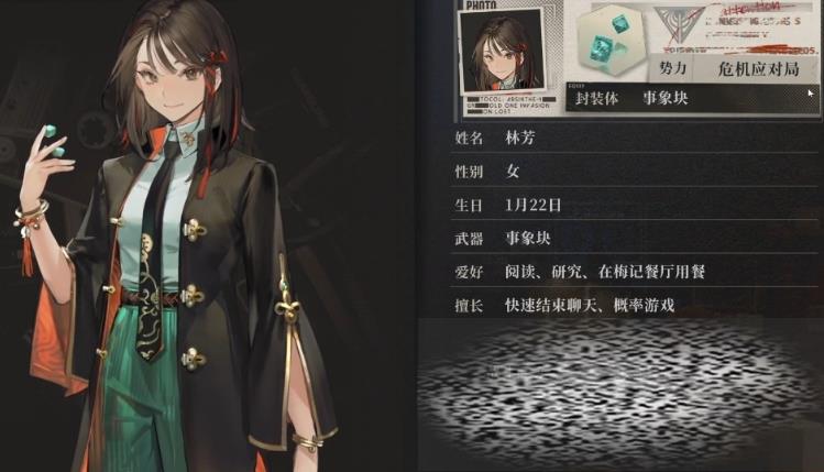 设定上面林芳曾是密斯特罗大学的客座教授,她在期刊上发表了一篇关于事象块的论文,这篇论文引起了应对局的高度关注,应对局对林芳的研究产生了浓厚的兴趣,并邀请她加入控制部,专注于事象块的研究,而在游戏中,林芳作为一名探员,对实验数据进行复查时发现了事象块的存在,这一发现不仅让她受到了事象块的影响,还使她获得了操控事象块进行战斗的能力,这一点是也是体现在她的封装体效果上面。