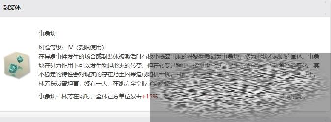 林芳的封装体事象块虽然风险等级为IV,属于高风险物品,但其实危险程度越高,能够带来的效果就越大,上面说到的事象块是一种在异象事件发生或封装体被激活时有极小概率出现的神秘物质,通常呈现为形状不规则的固体,因此非常不稳定,在游戏中只要林芳在场,全体己方单位的暴击率就能增加15%,随着游戏的推进,这种效果还能带来能量回复,为队伍提供持续的支持。