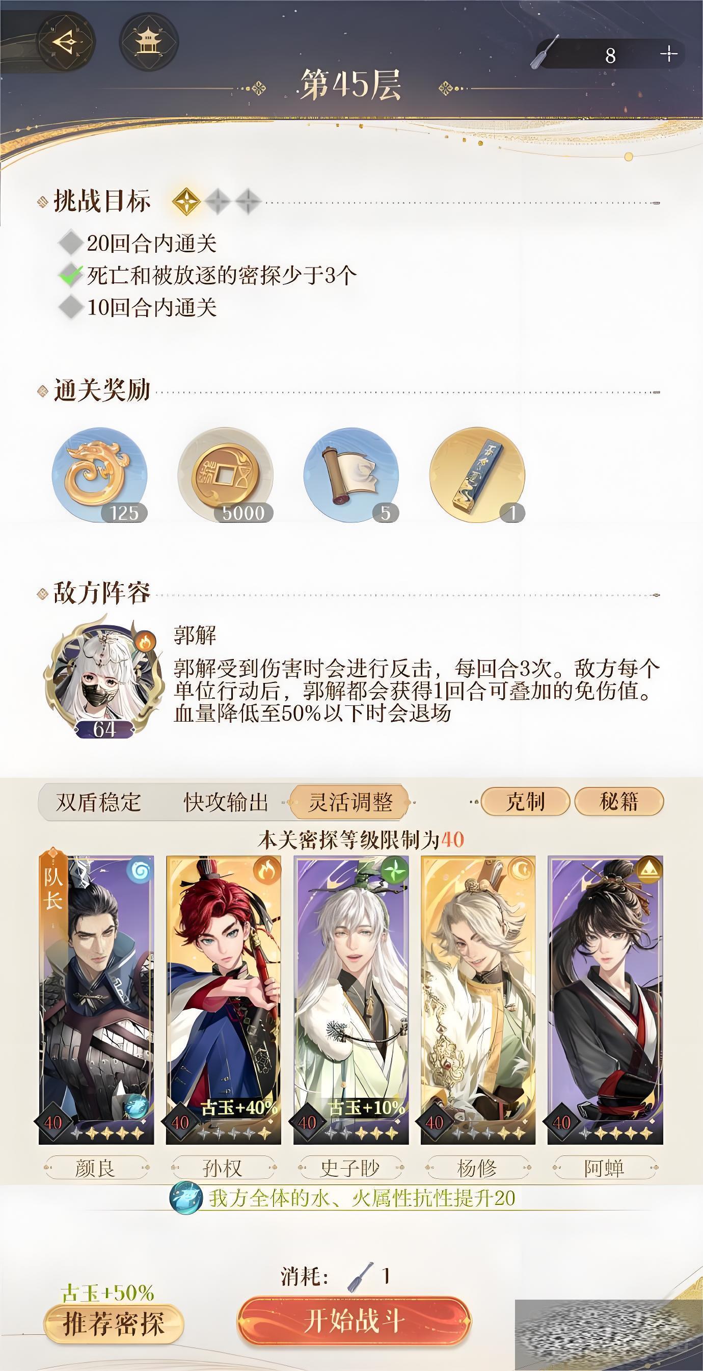 首先完成地宫45层1挑战的奖励有125个古玉和5000金币还有一些神秘道具。三星通关的要求有10回合内通关,过程中死亡或者被放逐的密探少于3个。这一层挑战的敌方boss是64级火属性的郭解。