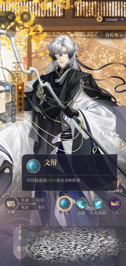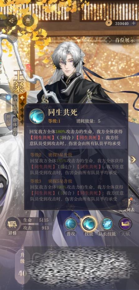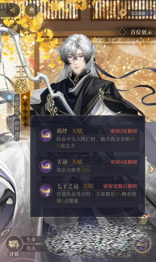 他的天赋也十分优秀,2星的时候会解锁天赋“羁绊”,效果为队伍无人阵亡的时候提升所有成员20%的攻击力,4星解锁天赋”苦谛”,效果为提升15%的攻击力,五星觉醒后的天赋是”七子之冠”能在任意队员受到攻击时,有2%概率获取1点能量。