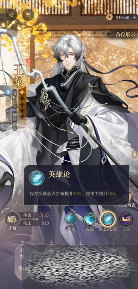 王粲的这个技能还能在升到三星的时候回复185%攻击力的生命,五星则是190%,王粲同时也非常适合作为队长,他的队长技“英雄论”可以让我方全体成员的最大生命和攻击力都提升15%。