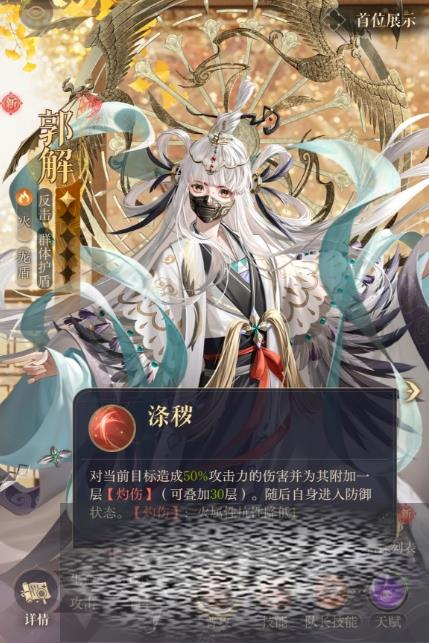 郭解的普通攻击涤秽能够对当前目标造成相当于自身攻击力50%的伤害,并为其附加一层灼伤的状态,这个状态不仅会降低目标的火属性抗性,还能叠加至多30层,使得敌人在面对火焰攻击时收到持续伤害,此外每当郭解发动涤秽,她都会进入防御状态,为即将到来的攻击做好充分准备,尽管郭解的行为常常出人意料,甚至有些鲁莽,但她的实力却是毋庸置疑的。