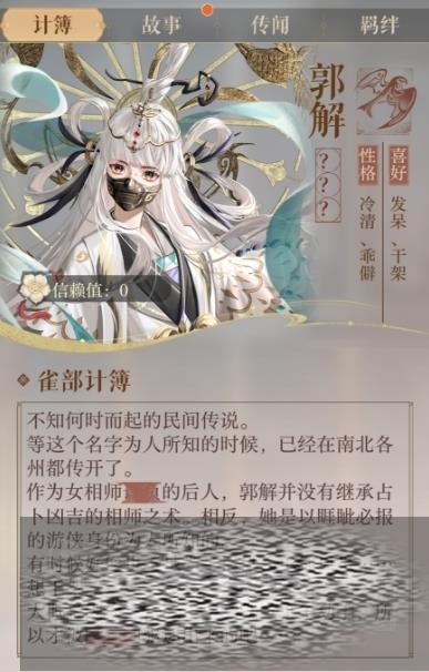 在游戏中为郭解设计的人设是一个性格乖僻的人,很多时候她都会自己陷入沉思,仿佛对周遭的世界漠不关心,然而,这并不意味着她缺乏行动力,相反,她对于打架有着异乎寻常的热情,仿佛血液中流淌着战斗的本能,作为女相师的后人,郭解并未继承家族占卜凶吉的传统技艺,而是选择了以游侠的身份闯荡江湖,她的行事风格睚眦必报,任何对她不公或挑衅的行为都会遭到她无情的反击。