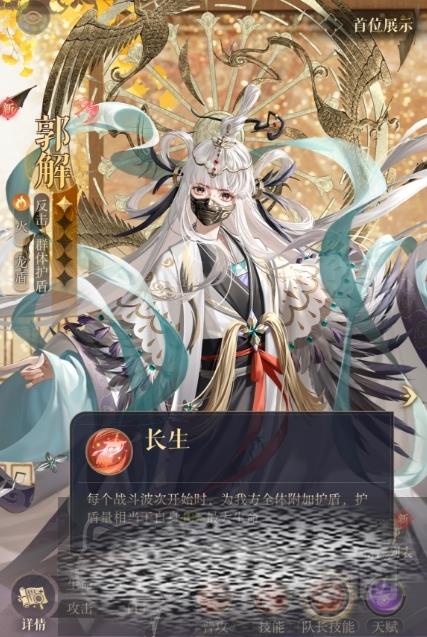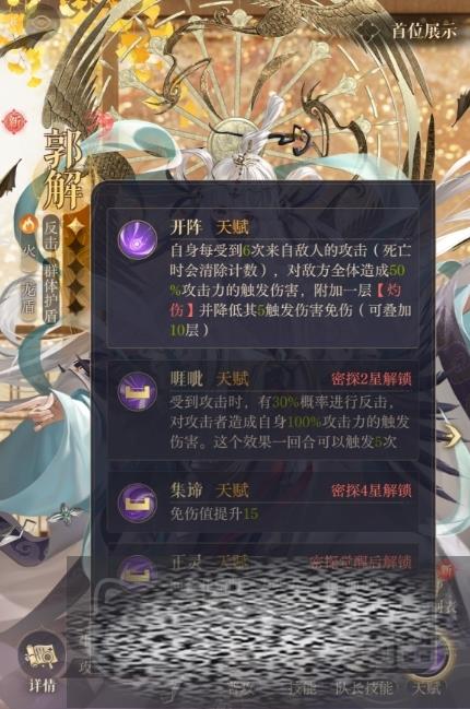 除了杀赦之外,郭解还拥有一项队长技能长生,每当战斗波次开始时,这项技能能够为我方全体成员附加一个等同于郭解自身40%最大生命的护盾,郭解的天赋效果也是她强大战斗力的重要组成部分,首先她的开阵天赋使她在战斗中具有极高的生存能力和反击潜力,每当自身受到6次来自敌人的攻击时,她便能对敌方全体造成相当于自身攻击力50%的触发伤害,并附加一层灼伤状态,但是角色死亡时会清除计数),不会累积到下一个对手身上。
