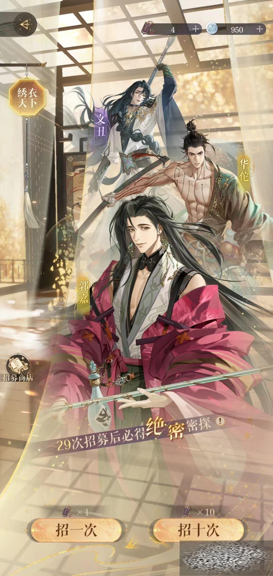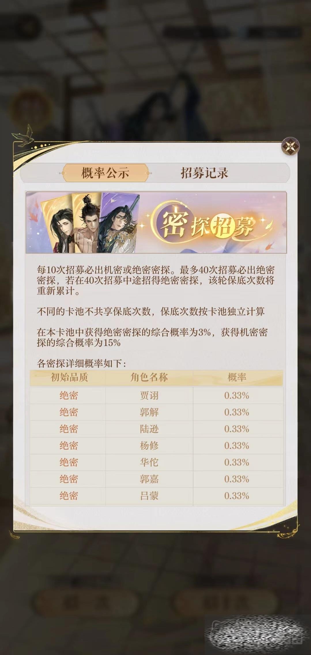 大家在游戏中打开招募功能之后,就可以看到当前所拥有的卡池,在卡池中进行抽取的时候是有着相应的保底设置。保底一共有两个,第1个是小保底,大家每进行一次10连抽招募,必定会出现机密或绝密品质的密探。第2个是大保底,最多进行40次招募,必定会出现一张绝密品质的密探。简单来说,即使大家的脸比较黑运气差,那么最多进行40次抽卡,肯定会获得一张绝秘品质的密探卡牌。但如果在40次抽取之内提前获得了绝密卡牌,那么保底次数也会重新开始计算。