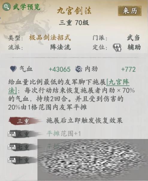 八卦剑法可以让三格内的友军获得内劲治疗,并且还可以将受到的伤害降低;九宫剑法则是将友军受到的伤害进行平摊,并且还能提供一定的治疗效果,每一次行动结束后还可以回复施法者的内功气血并持续两回合。