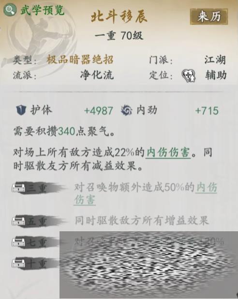 在后期可以把牵丝引机这个绝招换成北斗移辰,注意在北斗移辰的等级升到比较高之后再换哦,这一技能可以清除敌人所有的增益效果,还可以增加内伤伤害,在第十重时还可以让全体友军获得免疫控制和减益效果。