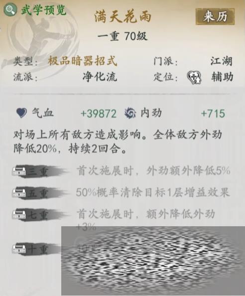 太上洞玄经可以提升全队的聚气,还可以提高全队的出手速度,也是一个很好的辅助技能;满天花雨则是可以降低外劲队的输出,如果是橙色的话可以降低百分之二十,还可以清除敌人的一层增益效果。