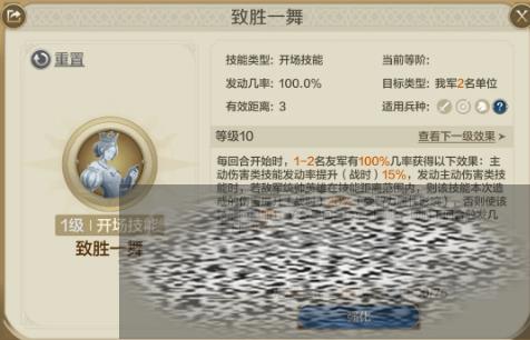 技能机制:克里斯蒂娜的技能能够在每回合开始时,为1-2名友军提供效果,包括提升主动伤害类技能的发动率15%和伤害20%(如果敌军统帅英雄在技能距离范围内)。这个效果在回合结束时清除,并且下回合的触发几率会下降10%。这个机制使得克里斯蒂娜在战斗中能够持续为队伍提供支持,尤其是在对抗具有统帅英雄的敌人时,她的技能能够显著提升友军技能的威力和效果。