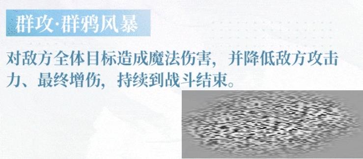 在此期间,该目标受到的伤害会得到一定的提升,同时从治疗技能中获得的恢复效果也会减少20%,更为关键的是,这种影响是无法通过任何方式驱散的,这使得摄魂之爪成为了快速消灭关键敌方单位的关键技能,在战斗中黑鸦夫人还能召唤一群漆黑的乌鸦猛扑向敌方全体,造成一定的伤害,这种伤害的独特之处在于其分配机制,它由所有受攻击的敌人共同承担,但任何一个敌人所承受的伤害都不会超过总伤害的一半。