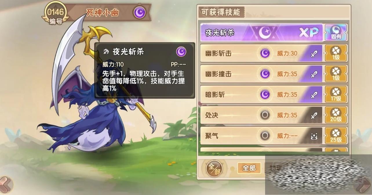 死神小幽的幽影斩击是一项物理攻击技能,使用的时候死神小幽会在刀刃上附加幽影之力,对对手进行精准而致命的斩击,这项技能的独特之处在于,它能够根据对手的血量来调整威力,如果对手血量越高,造成的伤害也就越大,让死神小幽在面对强大敌人时能够发挥出更大的作用,另一项绝技夜光斩杀它拥有先手+1的优势,意味着死神小幽可以率先发起攻击,占据战斗的主动权。