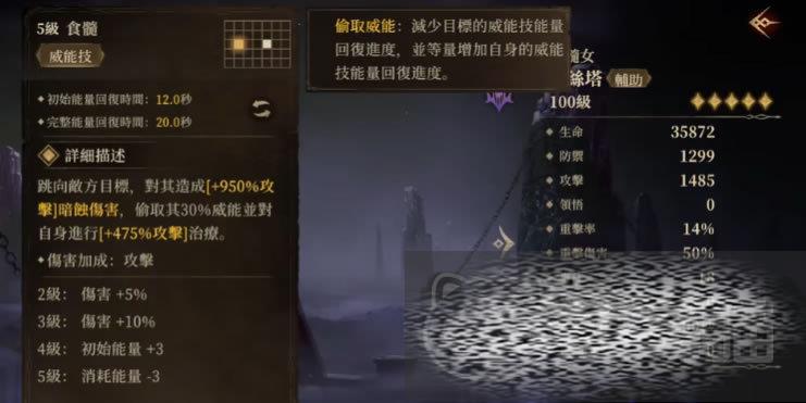 另外奎丝塔的威能技食髓,将对敌人单体造成一次极高的攻击伤害,并偷取对方的威能值作为给自己的医疗效果。这一招一般会选择对敌方血量较少的角色使用,尽量能做到一击秒杀对手,从而激活被动技能效果放大优势。