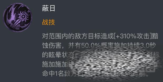 阿斯塔恩的二技能战技蔽日在释放之后可以对范围内的敌人造成伤害,并且有一半的概率可以造成持续三秒的眩晕效果,如果这个技能每命中一个敌人,就可以让自身获得五个点的威能。