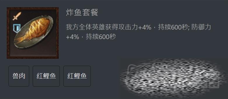 炸鱼套餐:由兽肉和两条红鲤鱼制作而成。这道菜不仅味道鲜美,还能为我方全体英雄带来战斗增益,食用炸鱼套餐后,我方全体英雄将获得攻击力+4%的提升,持续600秒,同时,炸鱼套餐还能为英雄们提供防御力+4%的加成,持续同样长的时间,这将使英雄们可以提高整体生存能力。