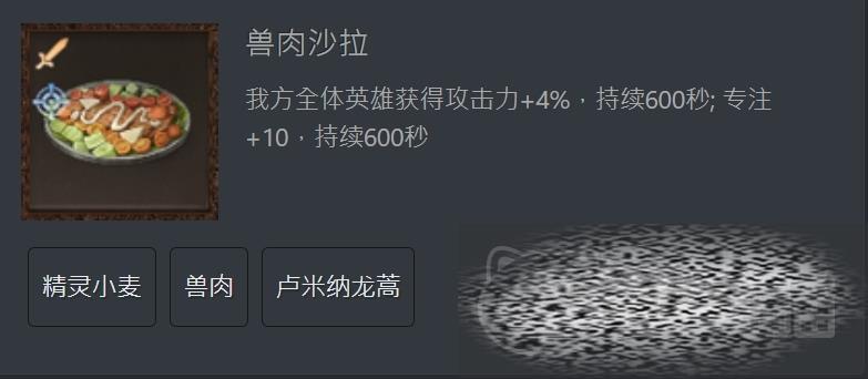 兽肉沙拉:由精致小麦、兽肉和卢米纳龙蒿搭配而成的美食,这道沙拉能为我方全体英雄带来强大的战斗增益,食用兽肉沙拉后,我方全体英雄将获得攻击力+4%的提升,持续600秒,这使得英雄们在战斗中的输出能力得到进一步提升,此外,兽肉沙拉还能为英雄们提供专注+10的效果,持续600秒,这将使英雄们在战斗中减少因其他牵制属性而导致的错误操作。