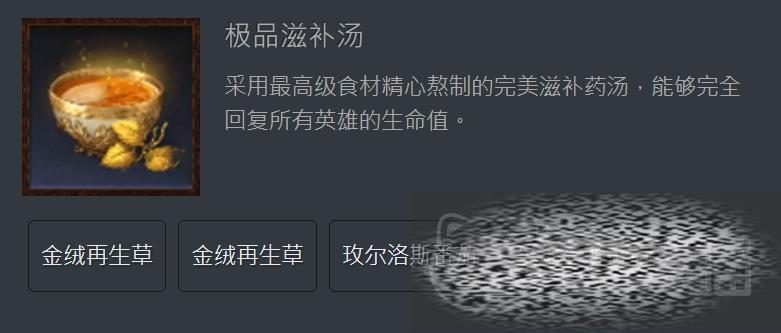 极品滋补汤和精致滋补汤则是游戏中最常用的两种食物恢复道具,极品滋补汤由两份金绒再生草和两份玫尔洛斯番茄采用最高级食材精心熬制而成,能够完全回复所有英雄的生命值。而精致滋补汤则由两份红叶再生草制成,拥有较强的治疗效用,能够完全回复小队中所有成员的生命值,这道汤品虽然制作相对简单,但同样具有不错的恢复效果,是玩家们在战斗中常用的恢复道具之一。