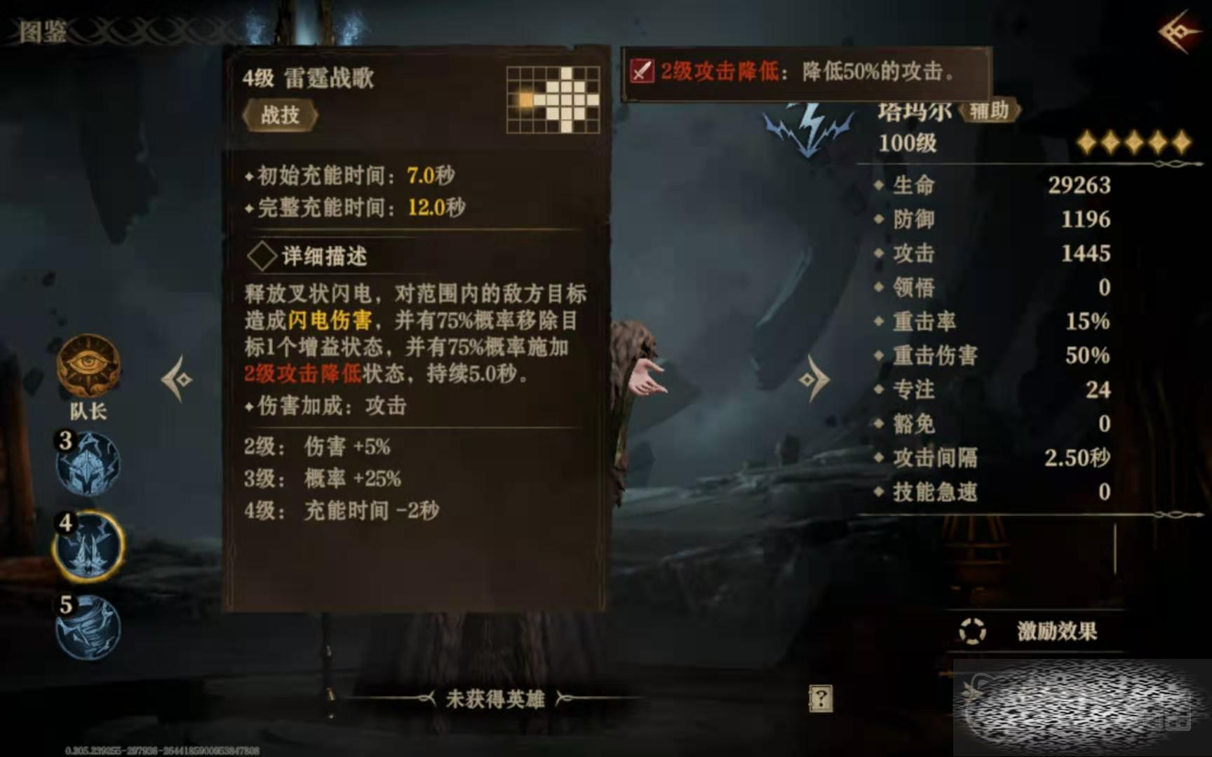 这个英雄比较擅长移除对手身上附带的增益效果,并使敌人陷入到眩晕状态中,便于己方去发动进攻。基于这个特性,后续玩家要着重培养它的专注值,要是资源充足的话,也可以提升一下豁免值。