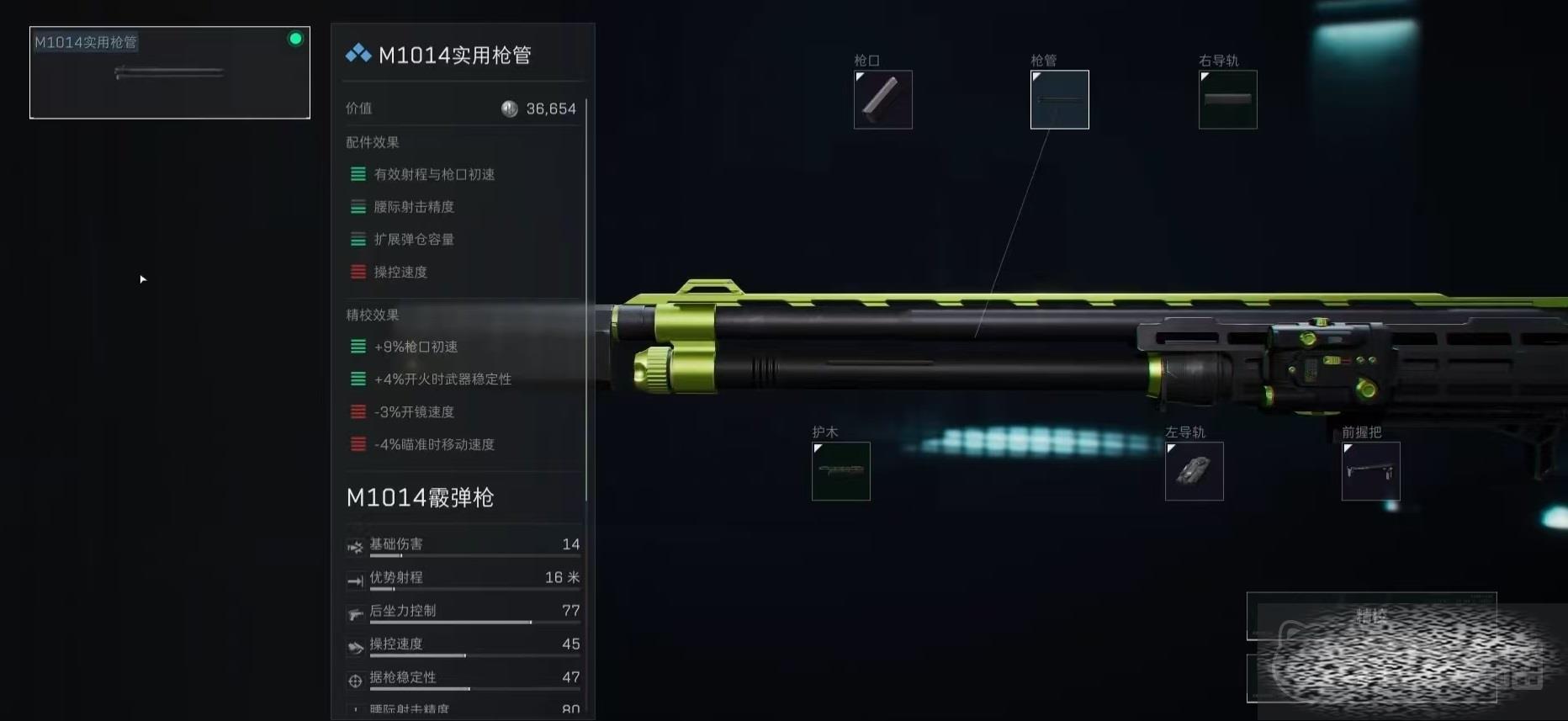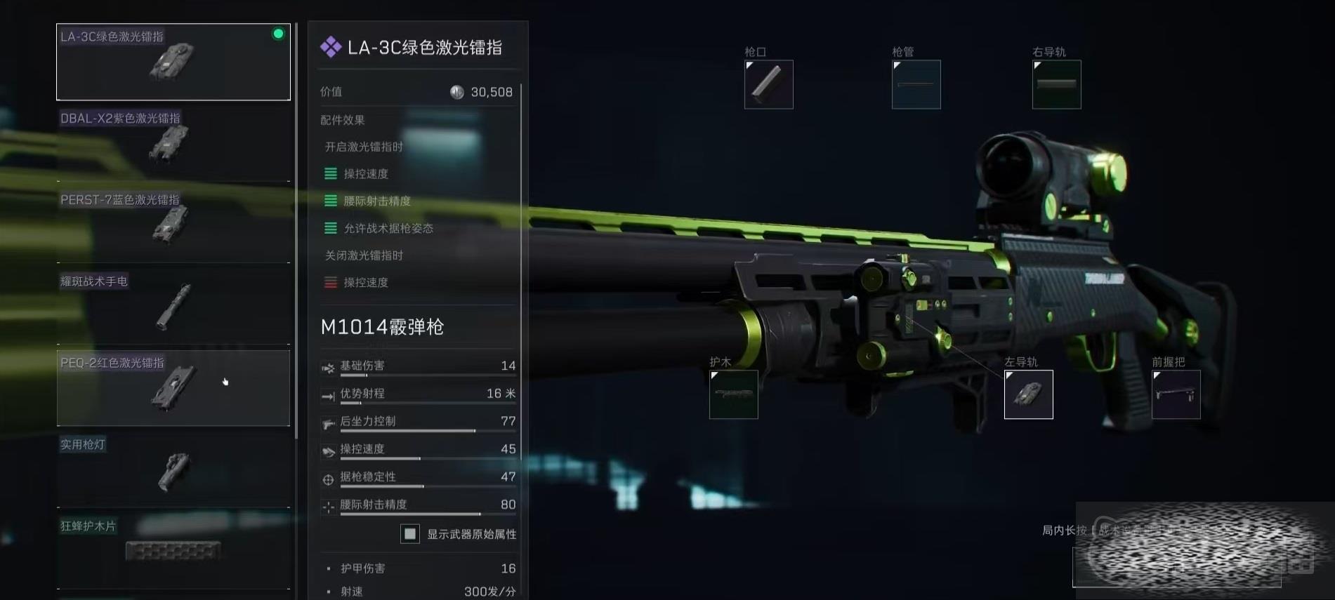 接下来推荐一款属性更强的满改配置介绍,枪管上搭配m1014实用枪管,能增加有效射程和枪口初速,提升腰际射击精度以及扩展弹舱容量等。枪口位置选择霰弹枪回声消音器,它有很高的枪声抑制程度,以及优秀的后坐力控制属性。配合上LA-3C绿色激光雷指,对于操控速度,腰际射击精度都有着更出色的增强。还有m1014导轨护木,提供扩展改装槽位,增加操控速度和后坐力控制。