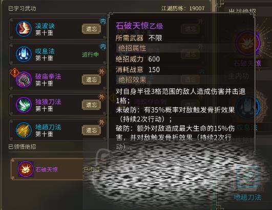 石破天惊不仅仅是名字震撼,它的实际战斗效果同样非凡。作为一门甲级绝招,它在游戏中的表现绝对不容小觑。只需悟性1点,你便能掌握这门可以改变战斗局势的强大技能。对于那些初入江湖的侠客们来说,石破天惊不仅能显著提升你的战斗力,还能助你快速打败强敌,成为江湖中的一代大侠。
