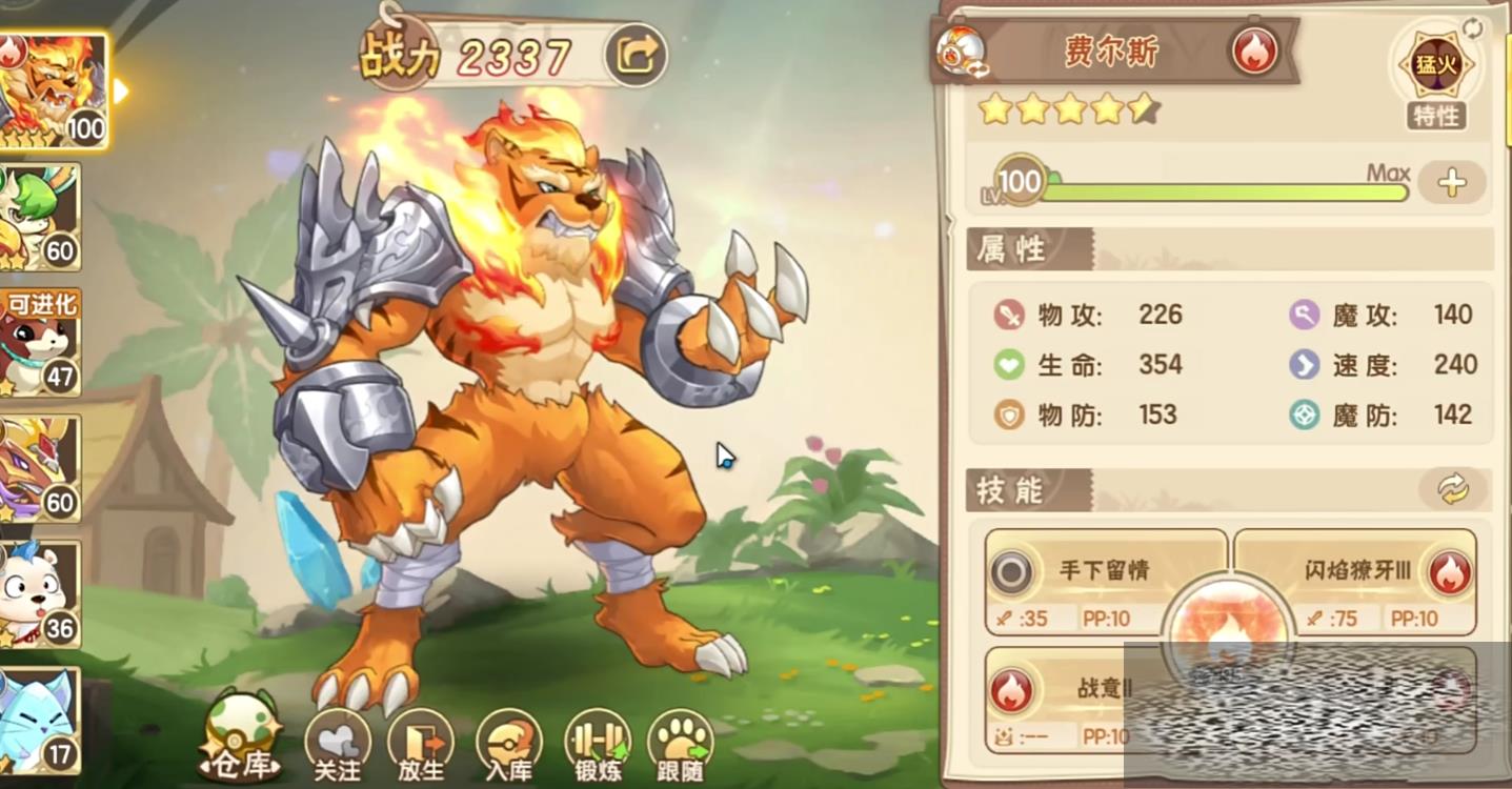 费尔斯的原型是一只老虎,他在游戏内总共有四个技能,第一个是普通攻击技能手下留情,总共会对敌人造成35点的伤害,同时费尔斯会获得十点的能量值,第二个技能是闪焰獠牙,该技能会对敌人造成75点的基础伤害,第三个技能是战役,该技能属于辅助类技能,在释放到对应技能时,费尔斯能够获得基础伤害倍率提升30%的buff,该buff会持续两个回合,由于该技能的特殊属性,建议玩家在释放大招之前先使用这个技能增加自己的基础伤害倍率,第四个技能是火焰爪,该技能能够对敌方两个目标造成65点的基础伤害,在伤害结算之后,费尔斯还能获得十点的能量值增长。