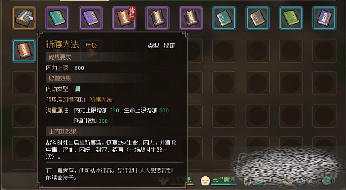所以前期利用白色士兵稳定血量健康,后期存好大招将所有士兵一举消灭就是本棋局的通关最佳方法,在顺利通关之后玩家会获得一本秘籍叫做祈禳大法,这个秘籍可以让我们在关卡中获得一次复活的机会。