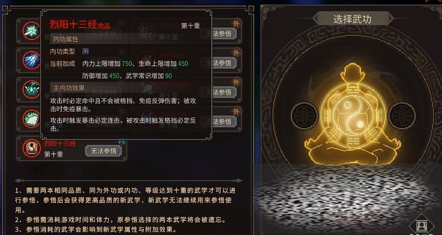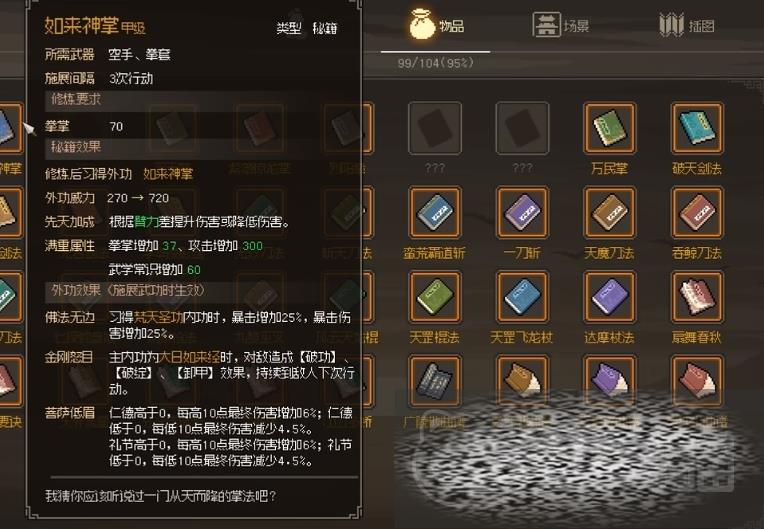 其中如来神掌的获取相对是比较难的,大家需要加入释法寺,并且在佛法感悟达到一定值时,分别领悟四块石碑雕刻,触发接下来的战斗,只有在四场战斗均取得胜利且拳掌技能达到50以上,才能获得该掌法。