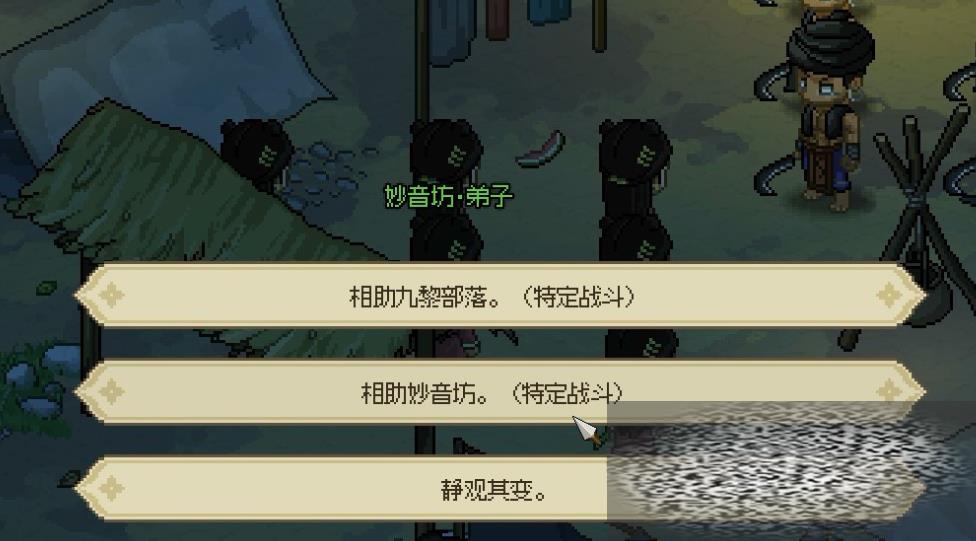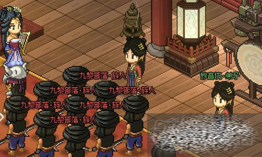 玩家在进入荒废庭院的时候会触发妙音坊与九黎部落战斗的剧情,这里我们选择帮助妙音坊,帮助完后就可以得知妙音坊具体位置,之后直接点击地图上的位置前往,进到屋子后会发现有很多入侵的九黎部落族人,我们依旧选择帮助妙音坊,将九黎部落打败后,坊主付瑶琴会先感谢我们一下,然后让我们三天后再来。