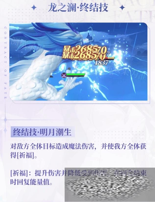 至于她的大招叫做明月潮生,能让她化身为水龙王。并控制世界中所有的水源,然后源源不断地朝着敌人翻涌而去。最终造成高额的魔法伤害,爆发性极强。另外还可以协助所有的队友获得祈福效果,在祈福的期间能增加所有人的伤害。并减少敌人对我方的输出伤害,此消彼长之下能获得的增幅自然巨大。结束回合后,还可以恢复所有人的能量值。