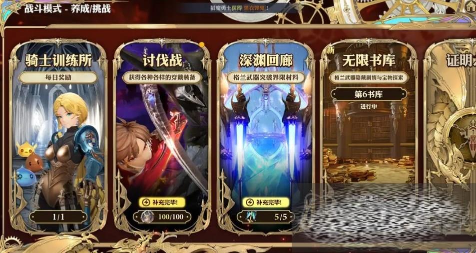 深渊回廊,结晶和龙珠的主要获取途径,能给格兰武器提升实力,也是需要刷的。击灭战,能概率获得特殊套装,基本上都是大佬在刷,新人直接无视。无限书库,挑战关,首通一次拿个奖励就不用再来了。
