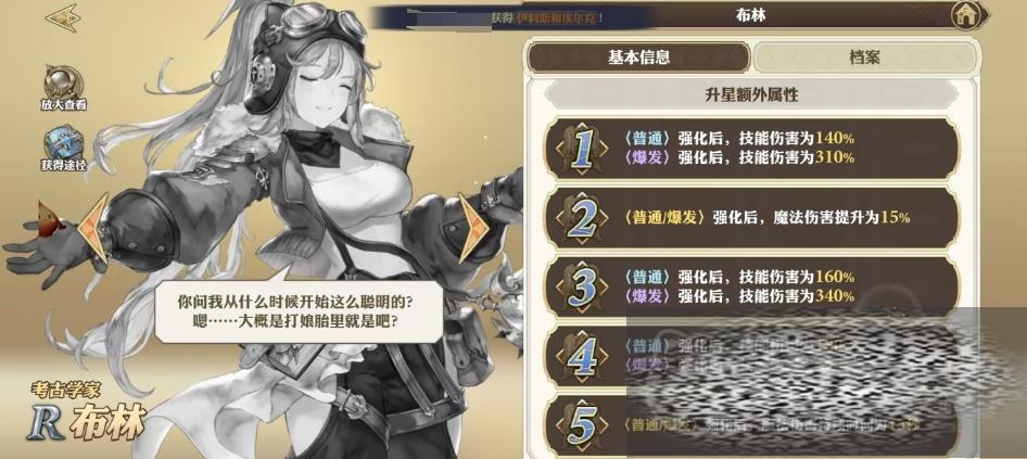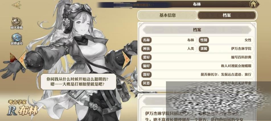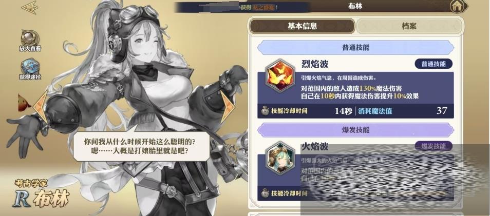 布林厌恶赫托尔永远无法毕业的情况,她不喜欢长期停留在一个地方,她是一个自由如风的少女考古学家,渴望探索未知的世界,布林的故事充满了对自由和探险的向往,烈焰波是布林的普通技能,它的冷却时间为14秒,消耗魔法值为37点。