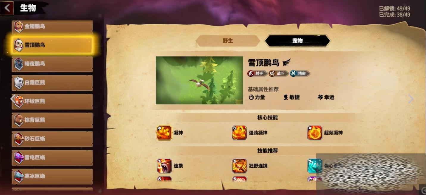 雪顶鹏鸟是一种飞行宠物,它的属性为射手,战斗和精密。雪顶鹏鸟可直接提高部队攻击力,并在英雄对目标施加破防校效果时,普攻概率提升额外伤害。【凝神】是雪顶鹏鸟的基本天赋技能。其效果可以通过不断抓捕和放生获得。该凝神可以增加部队的攻击力或在特定条件下提供额外的伤害加成。