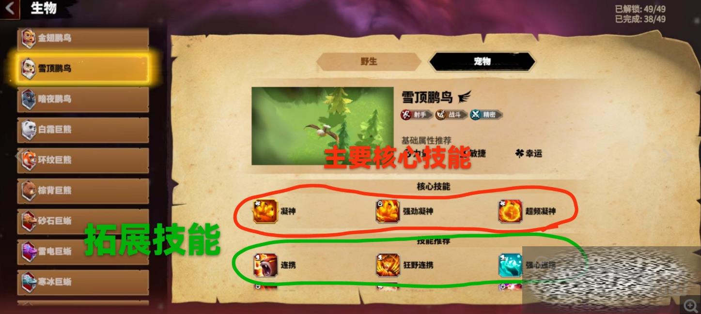 雪顶鹏鸟可以通过游戏中的抓捕系统获得。玩家需要前往指定的地图区域,使用抓捕道具对雪顶鹏鸟进行抓捕。根据雪顶鹏鸟的基础属性进行洗练,以提升其属性值。洗练时,应优先保证基础属性达到S级,以最大化其技能效果。玩家可以根据自己的英雄和兵种情况,为雪顶鹏鸟搭配合适的技能。在选择技能时,应注意技能间的搭配和与宠物本身的契合性。