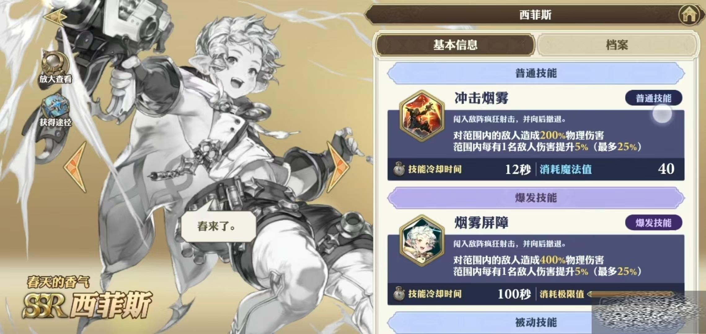 爆发技能也是相同的效果,爆发技能烟雾屏障,对范围内的敌人造成400%物理伤害,和普通技能一样,同样是一名敌人增加5%伤害,最多25%。能够按照输出范围内的人数来提升伤害是比较有特点的设计。当然游戏中具有这样效果的格兰武器也不止西菲斯一个,是比较不错的范围输出技能。