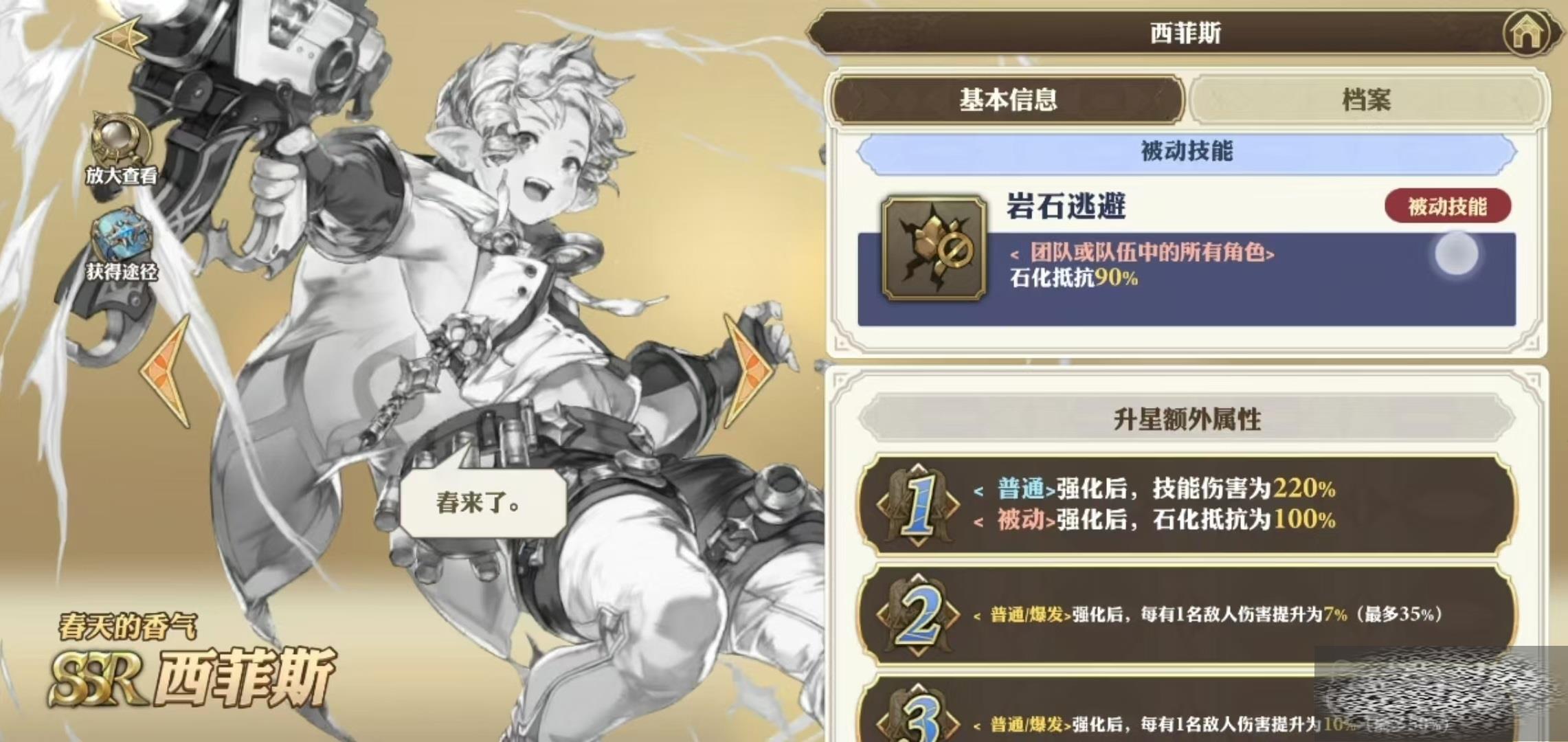 它所具有的被动技能是岩石逃避,使队伍中的所有角色增加90%石化抵抗能力,石化抵抗也是限制效果中的一个,这样的被动加成并不算太让人满意,只有在特定战斗中才有效果。