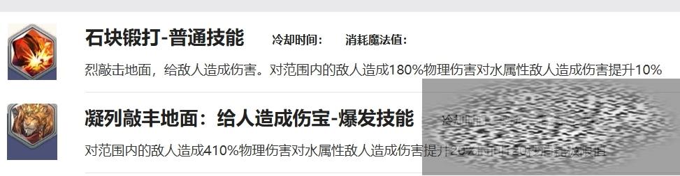 技能上面他的普通技能叫做石块锻打,冷却时间比较短,消耗魔法值也不多,使用的时候会强烈的敲击地面,给敌人造成伤害,对范围内的敌人造成180%物理伤害,对水属性敌人造成伤害提升10%,爆发技能叫做凝列敲丰地面,这个技能相对来说更好用,可以对范围内的敌人造成410%物理伤害,对水属性敌人造成伤害提升20%,持续时间120秒,消耗极限值。