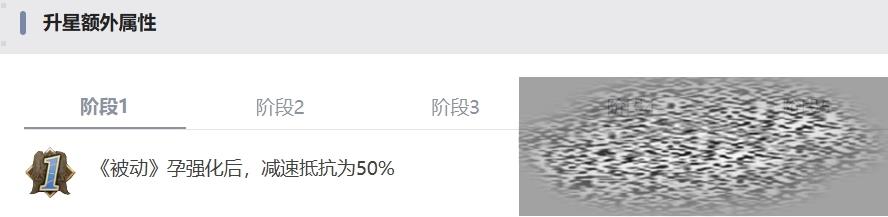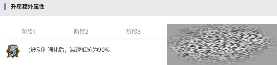 升星阶段3被动技能强化后,减速抵抗为70%,升星阶段4普通技能强化后,技能伤害为180%。爆发技能强化后,技能伤害为410%。升星阶段5也还是最后一个阶段被动技能强化后,减速抵抗为90%。