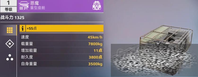 恶魔座舱来自于废土世界最大的座舱座头鲸,虽然相比较座头鲸恶魔在自重、耐久度等多个方面都有所降低,但它的强度在于有两种不同的模式,分别能满足战斗和机动两种不同需求,先来看看第一个机动模式,在机动模式下能提升载具50%的速度,和50%的马力。