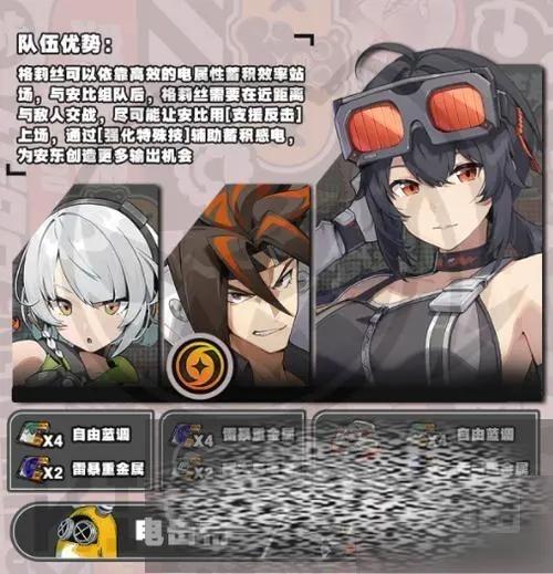 在作战的时候,格莉丝做为对于的主力输出需要依靠自身电属性的优势站在前排对敌人猛烈的输出,安比可以利用自己强化特殊技的辅助技能来帮助安东可以拥有更多的电感,拥有更高的输出环境。