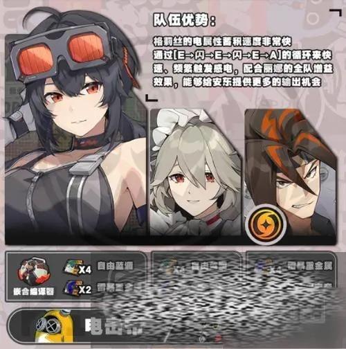 除了这个队伍之外格莉丝还有两个不错的阵容可以选择,第一个就是由格莉丝主输出,安东打配合,丽娜做辅助的电击队,在这个对于中格莉丝在输出的时候可以利用自身电属性积蓄比较快的这个特点使用循环的方式不断的对敌输出,丽娜则在这时可以用自己的增益来创造可以让安东不停输出的机会。