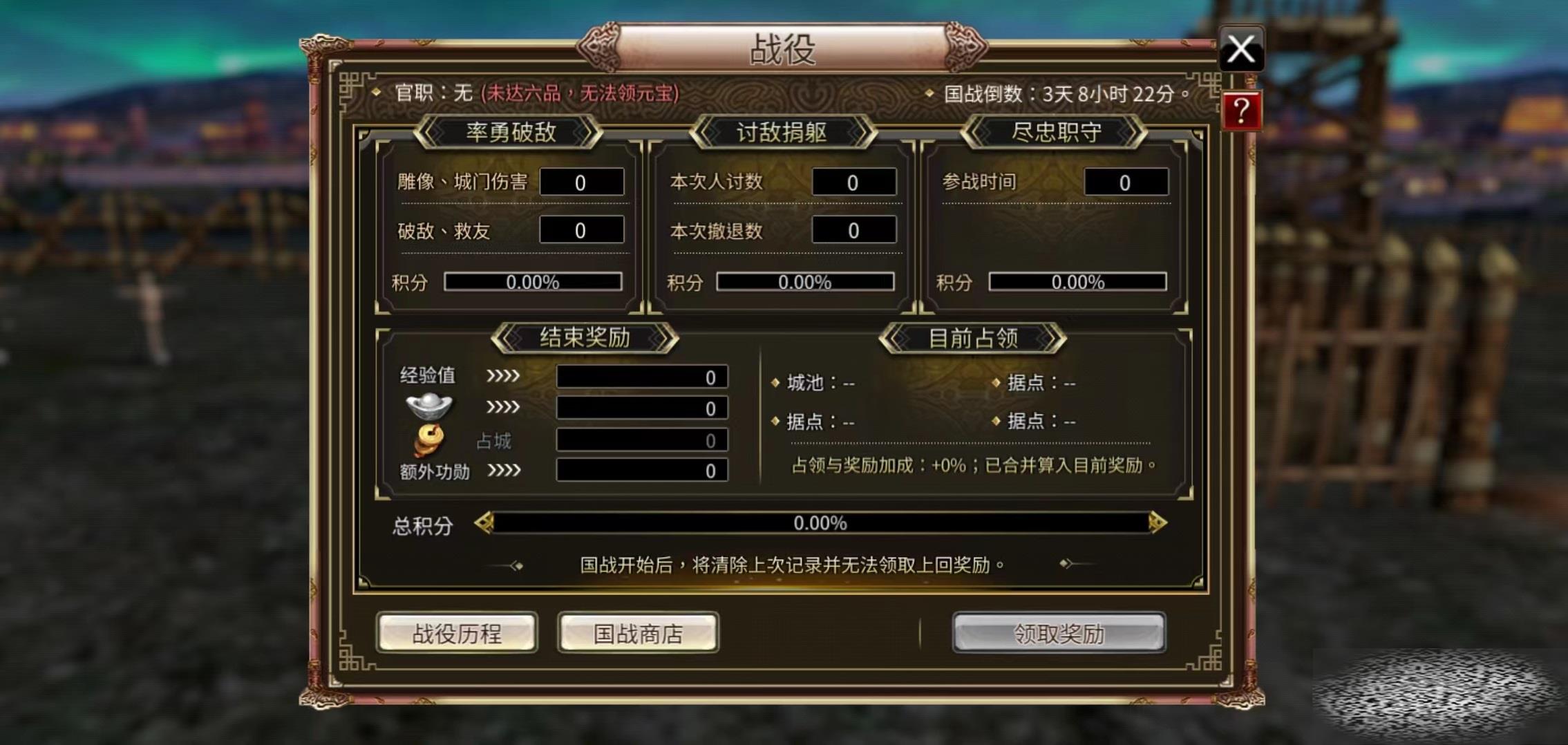 目前大家获取更新最主要的途径就是参加国战,点击进入战役选项后,可以看到自身在国战中的表现。国战是游戏中最重要的活动,在此期间大家可以自由攻击敌对势力的敌人,也可以通过击败城池雕像的方式来占领敌方势力城池。